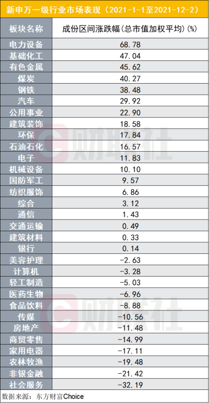 财联社(上海,记者 卢丹)讯,2021年,周期股“疯涨”,A股市场多次演绎“煤飞色舞”行情。据东方财富Choice数据,在新申万一级行业板块中,基础化工、有色金属、煤炭、钢铁年内区间涨幅分别为47.04%、45.62%、40.27%、38.48%,占据了涨幅榜前五席中的四席。