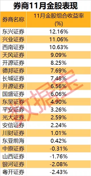 券商11月金股普遍表现良好,多家券商组合实现正收益。证券时报·数据宝统计,东兴证券、兴业证券、西南证券11月金股组合收益率均超过10%,分别为12.16%、11.06%、10.63%;天风证券、开源证券、德邦证券等券商金股组合收益率同样居于前列。