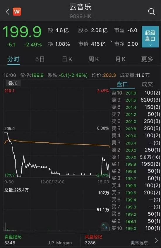 上市首日(12月2日),网易云音乐平开,报205港元/股,随后开始下跌并于盘中跌破发行价。截至当日收盘,公司股价收报199.9港元,跌幅2.49%,总市值约415亿港元。