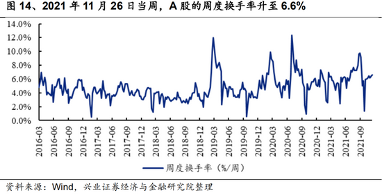 换手率可以间接反映市场的活跃度和风险偏好情况。2021年11月26日当周,A股的周度换手率升至6.6%。