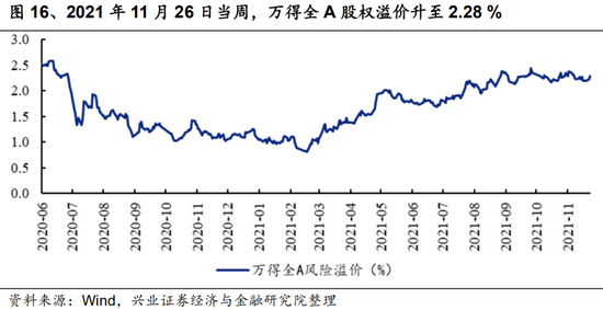万得全A股权溢价可以间接反映投资者对经济和市场的风险判断及定价情况。2021年11月26日当周,万得全A股权溢价升至2.28 %。