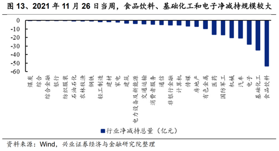 2021年11月26日当周,从行业的净买入(融资净买入-融券净卖出)来看,电力设备及新能源、有色金属、汽车、电子和银行板块的净买入居前,分别为33.0亿元、22.1亿元、21.8亿元、20.1亿元和17.4亿元;而房地产、建筑和建材板块净卖出靠前,分别为1.1亿元、0.8亿元和0.7亿元。