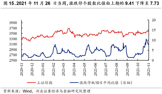 涨跌停个股数比值同样可以反映市场的活跃度和风险偏好情况。2021年11月26日当周,涨跌停个股数比值由上期的9.41下降至7.73。