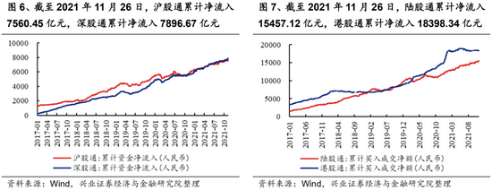 截至2021年11月26日,陆股通累计净流入15457.12亿元,其中沪股通累计净流入7560.45亿元,深股通累计净流入7896.67亿元;港股通累计净流入18398.34亿元。恒生AH溢价指数小幅上升1.1个点至144.20。