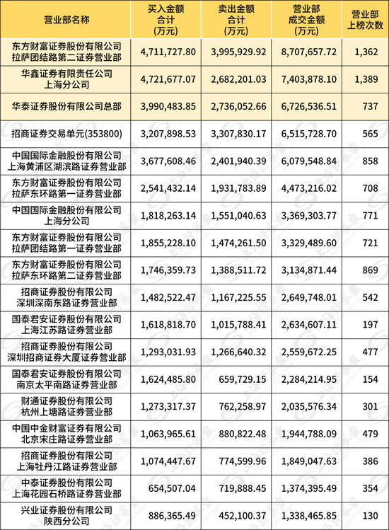 Wind数据显示,今年以来,东方财富拉萨团结路第二证券营业部、华鑫证券上海分公司、华泰证券总部包揽营业部成交金额的前三甲。其中,华鑫证券上海分公司以龙虎榜上榜1389次夺魁。截至目前,华鑫证券上海分公司上榜次数比去年全年高出591次。