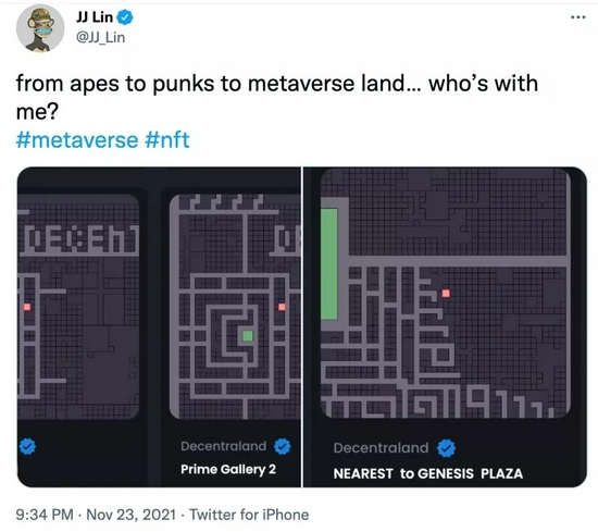 上周,歌手林俊杰也在推特上宣布,自己已在Decentraland上买了三块虚拟土地,正式涉足元宇宙房产界。据外媒估算,林俊杰购买这三块地花了大约12.3万美元。约合人民币78.4万。
