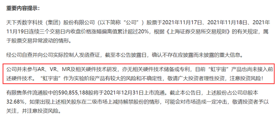 天下秀公司于11月19日晚间披露公告称,经公司自查,公司主营业务未发生重大变化,公司并未参与AR、VR、MR及相关硬件技术研发,亦无相关硬件技术储备或专利,目前“虹宇宙”产品也尚未接入前述硬件技术。“虹宇宙”作为实验阶段产品有较大的风险和不确定性。