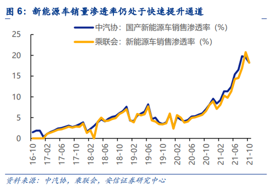 新能源车渗透率尚处加速提升期,22年销量预期进一步上调。据中汽协数据,10月国内新能源车销量38.3万辆,同比增134.9%,环比增7.2%,再超市场预期。10月新能源车销量渗透率高达18.2%,整体仍在延续自2020年9月以来的快速提升态势,提升幅度达12.2pct。展望2022年,随着30+款新车型的持续上市,各大车企进一步以更高性价比和更高产品力的车型开拓10-20万元主流市场,下游销量预期再度上调,渗透率提升尚有空间且大概率仍处于加速通道。下游景气同时带动上中游产业链,如动力电池、锂电设备乃至锂矿环节景气度的提升。产业链上,中游动力电池四季度提价有望逐步落地,明年盈利能力修复可期;锂矿22年供给增量相对下游需求增量而言较为有限,价格仍有提涨预期。
