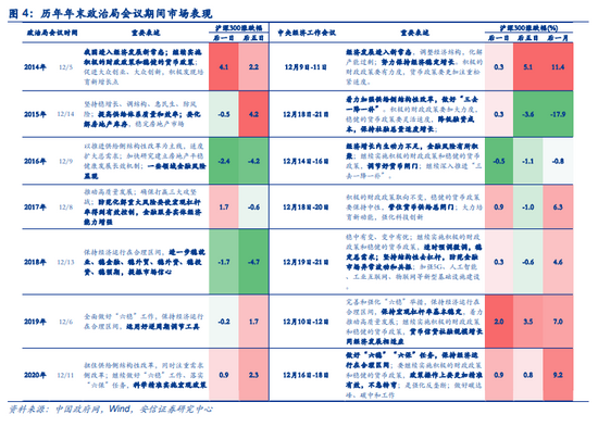 后续可持续关注12月中旬中央政治局会议和中央经济工作会议对明年经济政策的定调。从近几年来看,政治局会议一般与12月上旬或中旬召开,对下一阶段的财政、货币等大政方针定调,随后的中央经济工作会议则对重点工作进行部署。历史上看,20年中央经济工作会议的“不急转弯”、18年的“六稳”、16年的“防控金融风险”、14年的经济“新常态”均对后期的政策和市场产生重要影响,政治局会议和中央经济工作会议是政策转变的重要观察窗口。