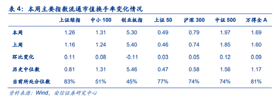本周主要指数换手率多数上行。本周上证综指,中小100,创业板指,上证50,沪深300,中证500,万得全A的流通市值换手率分别为1.26%,1.31%,5.30%,0.49%,0.79%,1.97%,1.69%,分别较前一周变动+0.11,+0.08,-0.11,+0.03,+0.05,+0.12,+0.09个百分点,分别处在83%,51%,45%,77%,74%,74%,81%分位数水平。