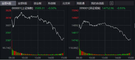 从A股来看,午后三大股指集体下探,沪指再失3600点;题材股回调,创业板指跌退守3400点。上证指数收跌0.5%报3589.31点,深证成指跌0.93%报14752.96点,创业板指跌2.09%报3405.93点。两市成交额超1.2万亿元,连续32个交易日突破万亿规模;北向资金实际净买入3.95亿元。