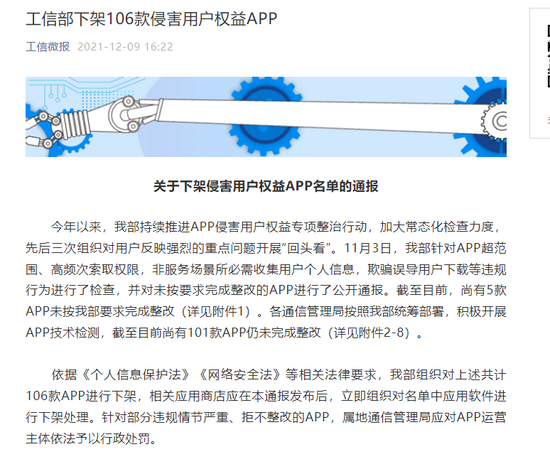 工信部今日通报称,11月3日针对APP超范围、高频次索取权限,非服务场景所必需收集用户个人信息,欺骗误导用户下载等违规行为进行了检查,并对未按要求完成整改的APP进行了公开通报。截至目前,尚有5款APP未按工信部要求完成整改;各通信管理局积极开展APP技术检测,截至目前尚有101款APP仍未完成整改。依《个人信息保护法》《网络安全法》等相关法律要求,工信部立即组织对上述106款APP进行下架处理,相关应用商店应在本通报发布后,立即组织对其进行下架处理。针对部分违规情节严重、拒不整改的APP,属地通信管理局应对APP运营主体依法予以行政处罚。