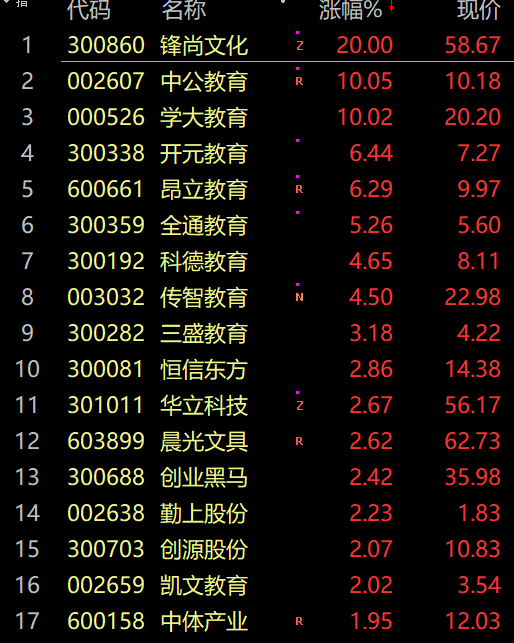 另外,教育股午后大幅走高,中公教育涨停,开元教育、豆神教育、传智教育、昂立教育、全通教育等跟涨。