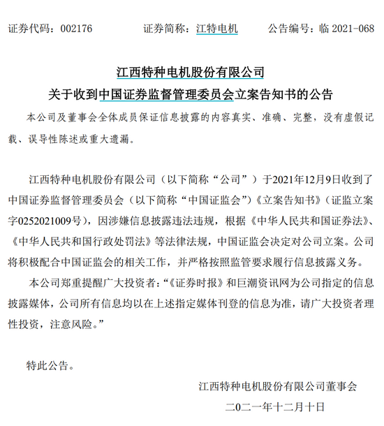 江特电机公告,因涉嫌信息披露违法违规,证监会决定对公司立案。公告显示,公司于2021年12月9日收到了中国证券监督管理委员会(以下简称“中国证监会”)《立案告知书》(证监立案字0252021009号),因涉嫌信息披露违法违规,根据《中华人民共和国证券法》、《中华人民共和国行政处罚法》等法律法规,中国证监会决定对公司立案。