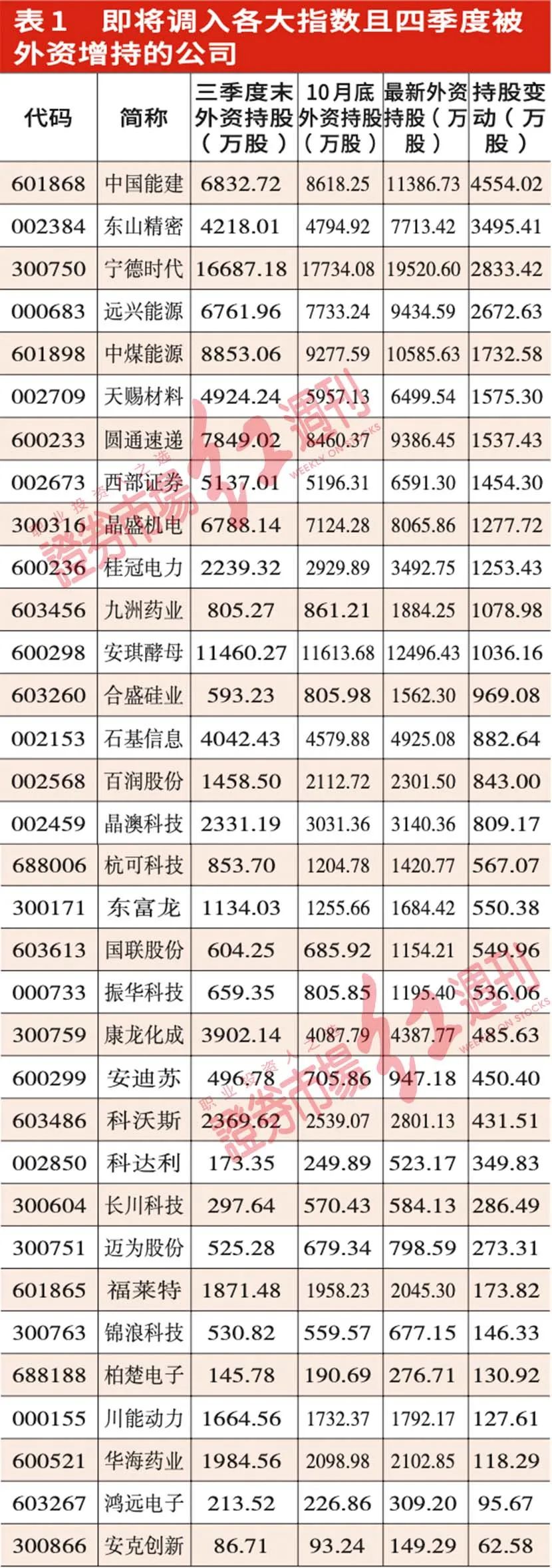 统计数据还显示,此次即将被调进各大指数的公司中,有33家公司四季度以来得到了北上资金的持续买进。