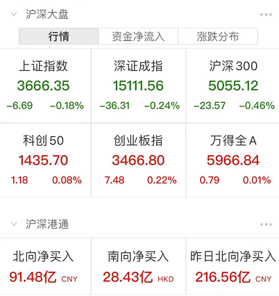 截至收盘,沪指跌0.18%报3666.35点,深成指跌0.24%报15111.56点,创业板指涨0.22%报3466.8点。两市合计成交12354亿元,北向资金净买入91.48亿元。