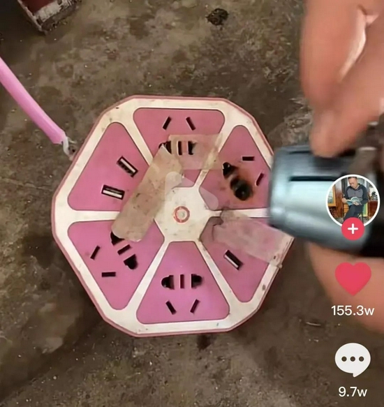在张同学的视频中,烧水用它、做饭用它,刮胡刀充电也用它,还常年不拔……但插线板上已经贴了多段胶布,还有一个插孔处明显被烧黑!