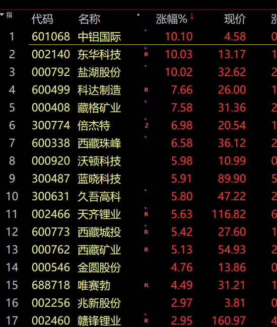 盐湖提锂板块再度爆发,中铝国际、东华科技等股封涨停板,2000亿龙头盐湖股份盘中一度涨停;