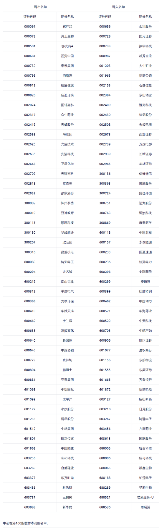 中证500指数则更换了50只样本,农产品、海王生物、鄂武商A等股票被调出的同时,金科股份、振华科技、越秀金控新进入。