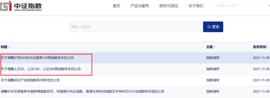 11月26日,11月26日晚间,中证指数有限公司网站发布公告称,根据指数规则,经指数专家委员会审议,中证指数有限公司决定调整沪深300、中证500、上证50、科创50等指数样本,自2021年12月10日收市后生效。