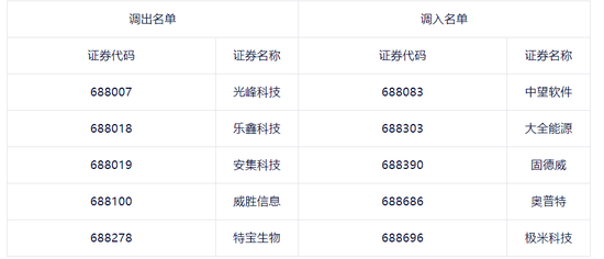 科创50指数替换5只股票,中望软件、大全能源等股票进入指数,光峰科技、乐鑫科技等个股被调出指数。