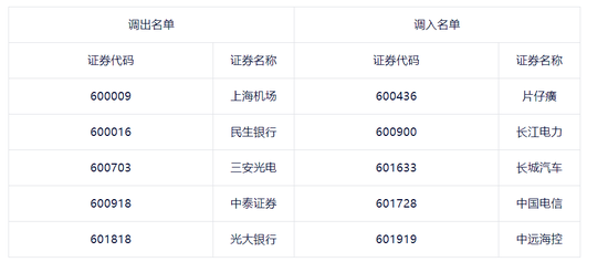 本次样本调整中,上证50指数更换5只股票,片仔癀、长江电力、长城汽车、中国电信、中远海控进入指数,上海机场、民生银行、三安光电、中泰证券、光大银行被调出指数。