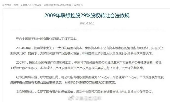 12月10日消息,联想控股今天发布声明称,经向中国科学院控股有限公司确认,2009年转让联想控股股权,严格按照国有资产产权交易相关要求进行了审计、资产评估和备案。并未造成国有资产流失。