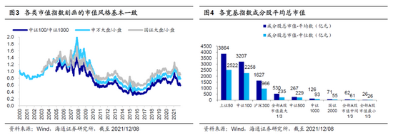 虽然前述指数是市场上公认的划分大小盘风格的指数,但是我们在《市值下沉?实则行业景气-20210912》中讨论过,当前A股上市公司已经超过4600家,按照个股市值从大到小三档均分,A股大、中、小盘三档的成分股应该都是1500只成分股左右,以这个标准来衡量,申万小盘指数其实在今天应该算大盘指数,中证1000指数也算大盘,国证2000属于中盘。而沪深300、中证100以及上证50等指数实际上代表的是大盘中的头部企业,应该称之为超大盘。我们将全部A股按照总市值从大到小排序,最大1/3个股的总市值平均数(截至2021/12/08)为530亿元(中位数235亿元),中间1/3平均市值为62亿元(中位数61亿元),最后1/3为26亿元(26亿元),而沪深300成分股平均总市值约1600亿元(中位数1000亿元),中证500成分股平均市值约270亿(230亿元),中证1000成分股126亿(93亿),国证2000则为71亿(55亿)。