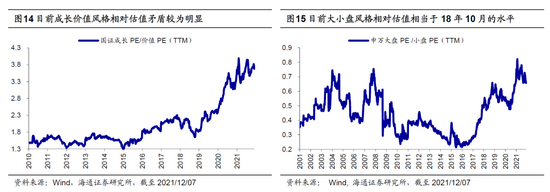 相对估值角度,目前成长价值风格分化较为明显,大小盘风格相对估值尚可。目前风格的轮动进行到何种程度了?我们从风格指数市盈率(TTM,下同)对比的角度进行分析:成长价值风格方面,在经历了三年的成长风格占优后,目前(截至2021/12/07,下同)成长价值风格的估值矛盾已经较为明显,国证成长PE相对国证价值PE的比值已达3.7,接近2010年以来的历史极值;市值风格方面,在今年市值风格略回归均衡后申万大盘PE相对申万小盘PE的比值已从今年2月的高点0.8降至目前的0.66,相当于18年10月的水平。值得注意的是,虽然目前大小盘的相对估值看似仍处于历史高位,但近年来注册制的推进已经使得大盘股相对小盘股的估值溢价趋势性上升:过去注册制实施之前企业上市成本较大,因此一些经营不善的小市值上市公司仍具有可观的“壳价值”,而注册制改革使得“壳价值”被极大压缩,公司股价与基本面的联系进一步加强,因此小盘股整体的估值溢价下降是趋势性的。