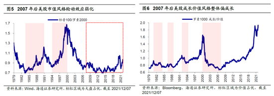 美股:2007年以来美股大小市值风格弱化,成长风格一枝独秀。我们先以时间序列更长的美股为例,用标普100相对罗素2000的走势来刻画1979年以来美股的市值风格轮动,可以发现在2007年以来美股的市值风格轮动明显弱化:1983-2007年期间美股经历了两轮完整的大小盘风格轮动周期,且在大盘风格占优的区间内标普100相对罗素2000的比值均翻了一倍,而2007年至今(截至2021/12/07,下同)美股市值风格整体略偏大盘,但标普100相对罗素2000的比值基本在0.7-1.1内波动,相较过去美股市值风格的影响明显减弱。