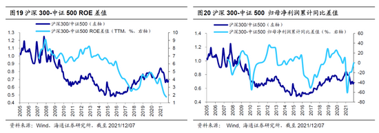 2022年沪深300有望略优于中证500。除了大小盘和成长价值外,市场上也常见用沪深300和中证500的对比来刻画市场风格。回顾历史,沪深300和中证500的相对走势轮动与大小市值风格接近,05-08年沪深300整体优于中证500,09年-15年中期间中证500相对沪深300表现优异,而15年中往后的时间内沪深300整体跑赢中证500,今年两者的相对趋势又开始略向中证500回归。与市值和成长价值风格类似,沪深300和中证500之间的轮动背后核心驱动力同样是盈利相对趋势,今年沪深300相对中证500走弱便源自于沪深300的盈利相对优势在减小,沪深300-中证500的ROE(TTM)差值从20Q4的4%降至21Q3的2%,同期归母净利润累计同比差值也从10%降至21Q3的-18%。展望2022年,我们预计全年沪深300归母净利润同比为7%,中证500为2%,业绩相对占优的情况下明年沪深300有望略优于中证500。
