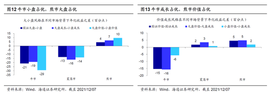 熊市阶段:价值与大盘占优。我们将2007/10-08/10、10/11-12/12、15/06-16/01、18/01-18/12这四个时间段均划分为熊市,在这四次熊市中,国证价值指数的区间年化收益率分别跑赢国证成长指数3、4、3、9个百分点,国证大盘指数分别跑赢小盘指数-5、7、12、5个百分点。