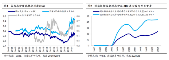 市场上另一种划分价值成长风格的方法是直接看沪深300和创业板指的相对走势,背后的依据是创业板指的成分股选自创业板,可以用来代表成长股,而沪深300成分股选自沪深两市市值最大的300只个股,基本代表价值股。然而这种简单的划分方式实际上存在两个问题:一是两个指数存在成分股上的重叠。随着创业板公司不断发展壮大,许多公司时至今日已经满足纳入沪深300的条件,截至21Q3,创业板指成分股中有1/4的个股同时也属于沪深300指数,比如大家熟知的东方财富、阳光电源、迈瑞医疗等,这些个股占创业板指的权重高达44%;二是沪深300内部也有价值股和成长股,对应的指数为沪深300价值指数和沪深300成长指数,两者的相对走势与国证价值与成长的相对走势基本一致。
