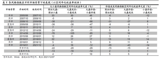 牛熊周期与风格:牛市小盘/成长占优,熊市大盘/价值占优。不同的市场环境下哪些风格会占优呢?我们根据2005年以来的A股历史做了简单的回测。我们综合考虑了上证综指和万得全A指数表现后将市场划分为牛市、熊市、震荡市三个阶段,然后计算了各类风格指数在三个阶段的表现(以区间年化收益率刻画),具体结果如下: