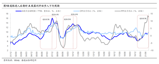 2022年大盘和价值或略优。展望2022年,从整体市场环境来看,我们认为A股在经历19-21年三年上涨后或将迎来阶段性的修整,背后是通胀高位和盈利周期性回落的双重扰动:通胀方面,回顾2000年以来的典型通胀周期,CPI上行周期大约持续2年,PPI上行持续2-2.5年,当前这轮通胀周期中,CPI低点是20年11月-0.5%,PPI低点是20年5月-3.7%,截至21年11月仅分别上行12个月、18个月,从时间维度看,通胀上行周期还未走完。明年随着美欧等发达经济体的复苏趋势进一步确认,国际定价的大宗商品仍存在进一步上涨的驱动力。同时商品的涨价将推升全球通胀预期,美联储加息预期升温,美债利率的中枢上移。美债利率上移叠加通胀的压力,我国国债利率或将难以下行,进而制约A股估值抬升;盈利方面,2002年以来五轮A股的ROE上升周期平均持续6-7个季度,本轮ROE于20Q2见底,20Q3开始回升,预计将于22Q1见顶。明年二季度后A股ROE大概率开始步入下行周期,这是因为如前所述明年我国通胀压力或将进一步发酵,历史经验显示通胀后期A股ROE将逐步恶化,详见《通胀前期盈利上、股市涨-20210516》。