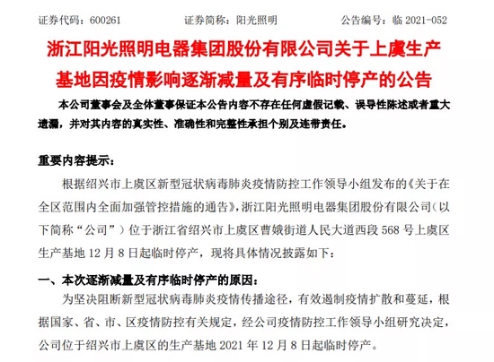 阳光照明则是因为上虞子公司停产而发布公告。阳光照明称,上虞生产基地目前主要生产LED照明产品,2021年1-3季度该基地营收占公司总营收的41.50%。