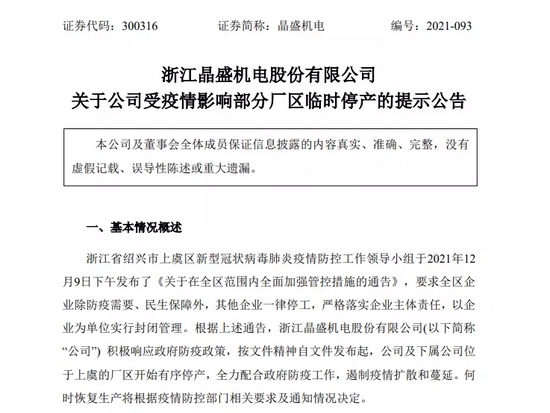 为积极响应和配合当地疫情管控要求,12月12日晚间,晶盛机电等多家上市公司公告相关子公司临时停工停产事宜。