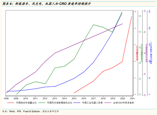趋势三:产业政策方向明确,大制造迎来新篇章,渗透率和国产化率双提升的趋势明确。能源转型、制造升级和创新药崛起的背景下,高端制造业等行业渗透率持续提升。近年来电动车销量、风光电装机量、工业机器人密度和CRO市场渗透率均处于持续提升中。与此同时,在贸易战和疫情冲击供应链的背景下,在各大细分领域,国内自主品牌国产化率也在逐步提升。