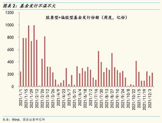 趋势一:影响市场风险偏好的不确定性因素逐步消退。最近一段时间,尽管A股市场成交额维持在高位,但整体市场风险偏好并不高,基金发行情况不温不火。影响市场风险偏好的因素包括货币和财政政策取向的不确定性、共同富裕政策和资本监管政策的不确定性等。中央经济工作会议对上述不确定因素均有较为明确的表态,不确定性因素的落地有助于年底年初市场风险偏好的回升。