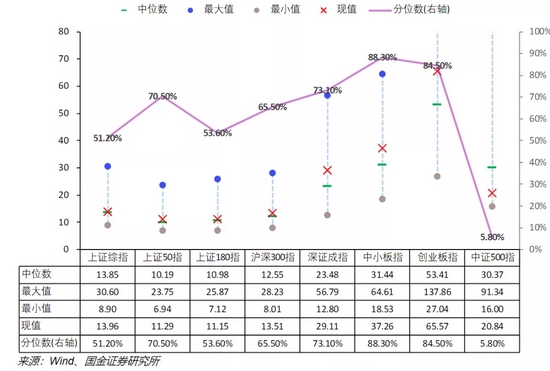 图为:截至目前A股主要指数PE(TTM)(自2010年1月起)