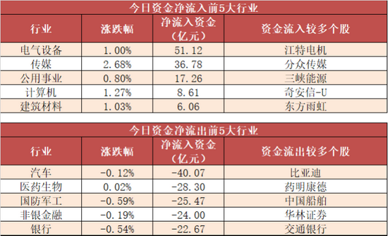 28个申万一级行业中,电气设备行业净流入51.12亿元居首。