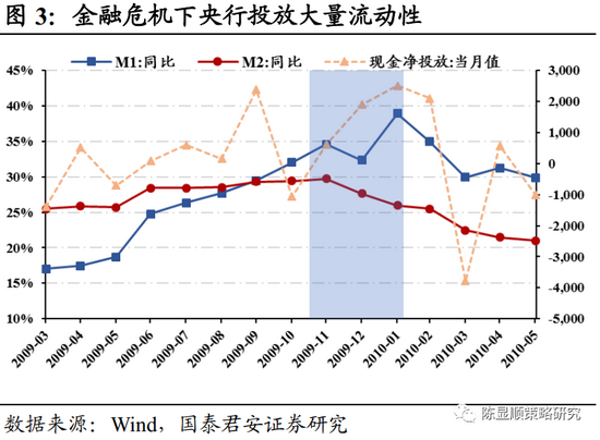 第一轮消费行情启动时点为2009年11月。金融危机后我国积极刺激需求,提供充足流动性。2009年为缓解金融危机对经济带来的冲击,在“保增长、扩内需、调结构”的目标下,我国出台了“四万亿”政策,家电下乡政策正式向全国范围推广,发布了《汽车行业调整振兴规划》并叠加购置税优惠刺激汽车下乡。同时向市场投放了大量流动性,新增贷款创下历史记录,货币信贷总量快速增长,2010年1月份M1同比达到38.96%,净投放2512亿元。