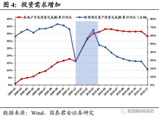 投资需求迅速增加,PPI上行向CPI收敛,在此期间CPI同时保持稳步向上的趋势。“四万亿”政策刺激和充盈的流动性下投资扭转疲态,持续回暖。在房地产投资的带动下,大宗商品、资产价格均快速上涨,2009年底PPI迅速上行,CPI保持韧性,剪刀差呈现快速收敛的态势。