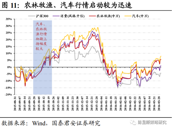 消费整体同步启动,农林牧渔、汽车稍胜一筹,后续汽车上涨动能更显充足。动物疫苗受益于蹄疫市场,量价齐升助力动物疫苗跑赢农业指数,糖价行情在股灾回调之后重新上扬等因素带动农林牧渔在这轮消费行情中最先反应。10月汽车购置税减半,叠加国务院常务会议提出进一步支持新能源的五项措施,汽车迎来新的行情,并在跨年行情中进一步扩大涨幅优势,带动消费风格走高。但总体而言,此次行情消费股整体反应较为同步,各行业之间表现差异较小。