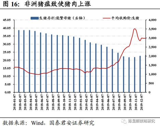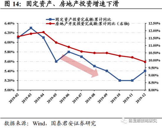 投资需求缺失导致PPI下行,剪刀差扩大。2019年全球经济增速明显放缓,主要发达经济体与新兴经济体经济增速下滑,我国在经济增长下行压力背景之下,投资需求持续羸弱,固定资产投资增速由年初6.10%持续下滑至5.40%,需求端乏力导致PPI不断下行,而CPI维持韧性,并且呈现抬头趋势,消费品持续涨价,年内猪价持续飙升,年底猪肉收购价相比年初翻番达33.69元/公斤,带动CPI上行,剪刀差扩大。