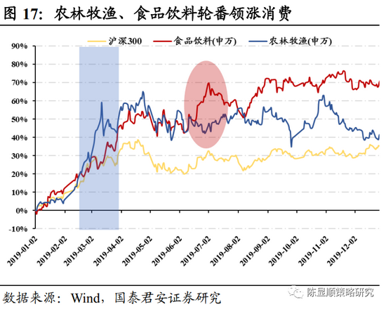 生猪价格上涨下农林牧渔拔得头筹,食品饮料脱颖而出。2019年非洲猪瘟爆发致使猪价飞涨,中小养殖的退出让行业规模趋于集中,生猪养殖迎来戴维斯双击,在2019年的消费行情拔得头筹,领先其他消费股成为行情初期最具超额收益的板块。但白酒在大众消费崛起背景下集中度提升,超额收益表现稳定,确定性机会吸引了众多资金参与,优势地位显现,2019年茅五泸的业绩超预期,茅台批价上行,白酒新的一波上涨行情引领食品饮料成为消费板块表现最为亮眼的行业。
