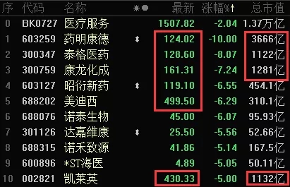 牛眼君(每经牛眼:njcjnews)发现,在药明康德所属的总市值达到1.37万亿元的医疗服务概念板块中,跌幅居前10位的个股中有6只个股股价超过100元/股,4只个股的总市值超过1000亿元。这从某种角度证明了高价大盘医药股存在的风险。
