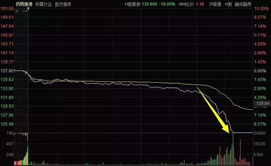 例如,属于医疗服务概念板块、总市值近4000亿元大白马药明康德今日虽然一路下滑,但在14点之前都还能接受,跌幅在3%左右。不过过了14点就有点不敢看了:股价快速跳水,39分钟后即封死涨停至收盘,跌停板上压了超过2万手大单,约合2.56亿元。值得注意的是,今日药明康德成交量巨幅放大,创出了近4个月新高,资金出逃的意愿很强。盘后龙虎榜数据显示,一个沪股通专用席位净卖出近7亿元,一个机构专用席位净卖出3.3亿元,分居卖1、卖2位置。