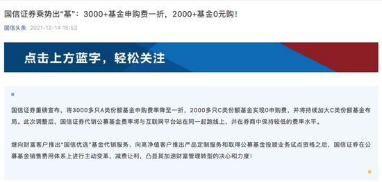 “3000多只A类份额基金申购费率降至1折,2000多只C类份额基金实现0申购费”,12月14日国信证券官方新闻号宣布了上述消息。