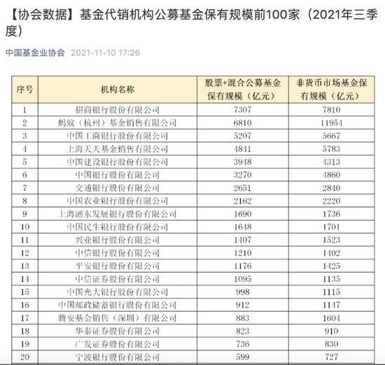 据中国基金业协会11月披露的2021年三季度公募基金代销机构保有规模前100家榜单,在“股票+混合公募基金保有规模”百强榜单中,券商数量为49家,占据三季度百强榜的近半壁江山。其中,中信证券、华泰证券、广发证券、中信建投证券、招商证券等头部券商的排名靠前。